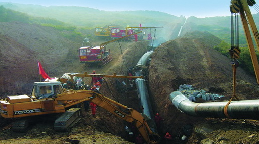 圖為施工人員利用微型手拉葫蘆進(jìn)行天然氣管道鋪設(shè)作業(yè)集中供熱工...